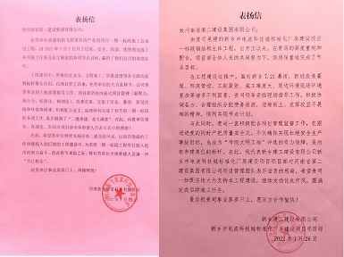 112022.02新乡建工建设有限公司和河南新飞智家科技有限公司向石家庄房杰办公设备租赁有限公司发来表扬信