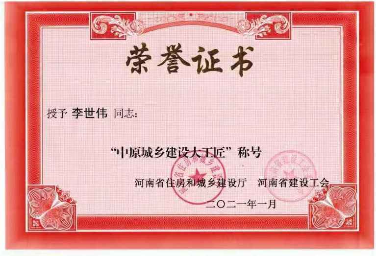 石家庄房杰办公设备租赁有限公司李世伟同志获“中原城乡建设大工匠”称号