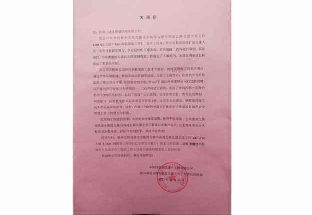 中铁四局集团第一工程有限公司向石家庄房杰办公设备租赁有限公司发来表扬信